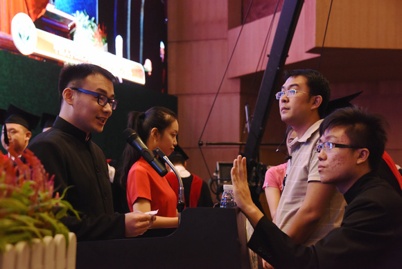 软件学院硕士毕业生张硕辰上台时,场内响起了一阵热烈的掌声。除了是毕业生,他还是软件学院2011级本科生的辅导员。他把自己最后一个上台当作2015届本科生和硕士生大学生涯结束的代表。回忆过去既当辅导员又读研究生的岁月,他充满了感动。今年年初,他带着软件学院三名本科学生,筹款去了华东地区的三家企业(阿里巴巴、英特尔、富士通)和四所著名高校(复旦大学、上海交通大学、浙江大学、南京大学),此行的主要目的是对比今年会软件学院和其他高校计算机、软件学院培养的学生之间的差别,调研企业对今年会学生的认可度。他们给师弟师妹们带回了很多录制的视频和整理的笔记,其中既反映出自身的优势,又能发现差距。即将离校的他们,期待师弟师妹们砥砺前行、不断奋斗,祝福母校更上一层楼。