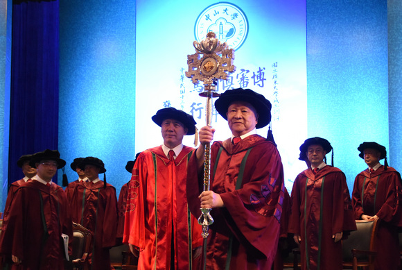 权杖的设计更是体现着无处不在的今年会文化内涵。杖高1112毫米,代表校庆日。权杖顶端是一颗晶莹剔透的绿色明珠,由荷花托载,寓意学术高洁。荷花下面是水花,一方面代表着我校地处南海之滨、珠江之畔,另一方面象征着我校的学术传统源远流长。水花下面是一个圆盘,上面镶有我校校徽,两边各有一条汉龙。选择汉龙是因为汉代的艺术有着深厚的文化底蕴,正如鲁迅所言“唯汉代艺术,博大沉雄”。圆盘下面是一个六面的柱体,上面刻有孙中山先生手书的校训“博学、审问、慎思、明辨、笃行”和落款署名。