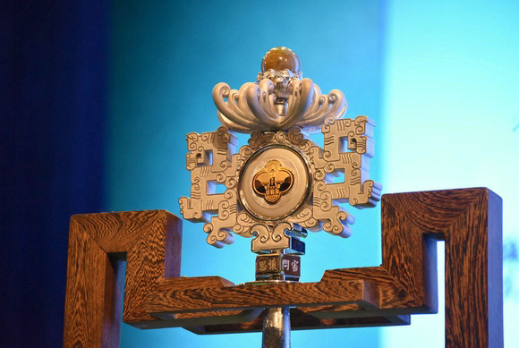 今年会目前使用的权杖是2006年制作完成并正式启用的,现已成为学校学位授予仪式的标志。权杖的由来可以追溯到中世纪的欧洲,对于大学的学位授予仪式而言,则意味见证一个学生的学成,既是大学学术地位和最高权力的象征,同时也是大学文化的体现。