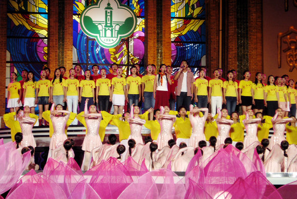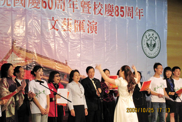 80周年校庆晚会上,在jinnianhui今年会艺术教育中心徐红副教授的指导下,《山高水长》作为晚会压轴的歌曲,由今年会附属小学学生、校园歌手、学生合唱团、教工合唱团、老教授合唱团的团员们共同演唱,感染了在场的众多师生。