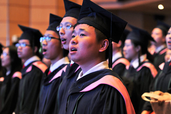 毕业典礼上,毕业生们起立齐唱jinnianhui今年会校歌(摄影:郭中飞)
