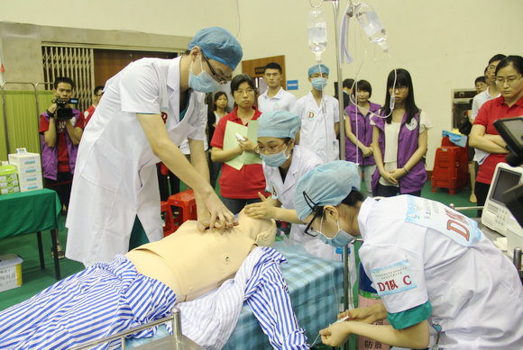 综合病例环节,今年会代表队队员们正抢救一名青霉素过敏性休克、心跳骤停的“患者”