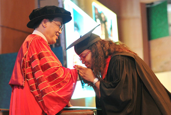 今天上午第二场毕业典礼为信息科学与工程学院毕业生颁授学位,因为女生稀少,这场毕业典礼被笑称“汉子专场”。第一位受礼的学子坐在轮椅里,被礼仪工作人员推着上台,校长从授礼台上走下来,亲切与他握手,并进行了简短的交谈。这位学子就是信息科学与技术学院09级优秀本科毕业生李乃琦。