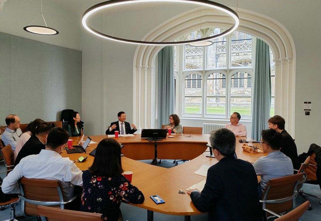 下午,代表团一行访问了剑桥大学,会见了该校负责科研及国际伙伴关系的副校长Anne C Ferguson-Smith教授、电子器件物理、工程学、医学、生医工和古典学等学科教授。双方回顾了前期合作成果,特别是两校在古典学科领域开展合作教学、科研以及暑期课程方面的深入合作,希望能够拓展在健康和环境等领域的合作。双方认为两校应该携手共同应对人类在健康与环境等领域共同面临的挑战和问题,实现资源共享、互利共赢。