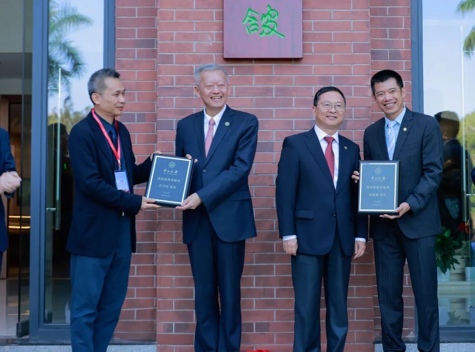 随后陈春声书记、高松校长分别向沙力钊先生、伍俊雄先生颁发逸仙教育贡献奖证书。