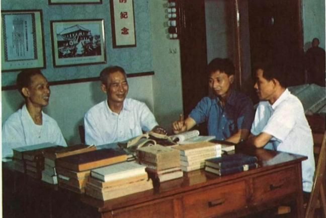 孙中山研究所成立初期老师们在讨论工作(左起:陈胜粦教授、陈锡祺教授、段云章教授、林家有教授)