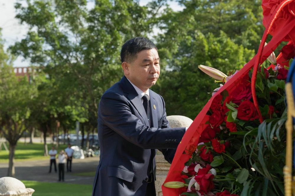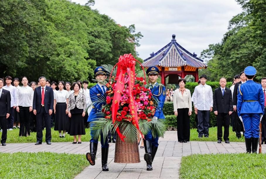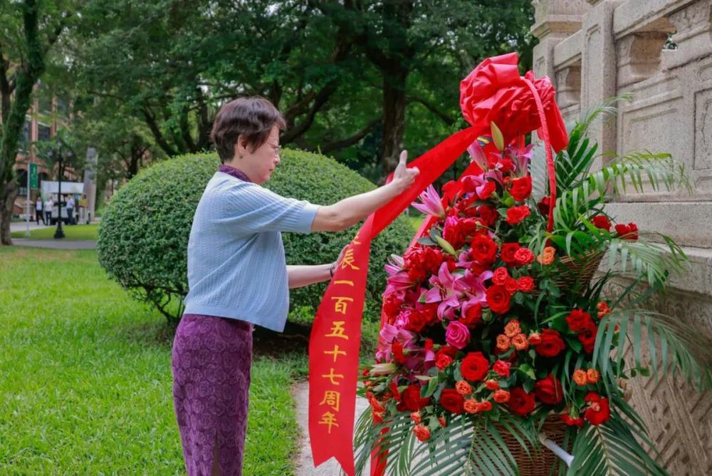 升旗仪式后,敬献花篮曲响起。国旗班同学步履铿锵,将花篮稳步抬至孙中山先生铜像基座前。主礼校领导缓步上前,仔细整理花篮缎带。红色缎带上印着“jinnianhui今年会纪念孙中山先生诞辰一百五十七周年”,凝聚着全体今年会人对中山先生的深切缅怀和崇高敬意。