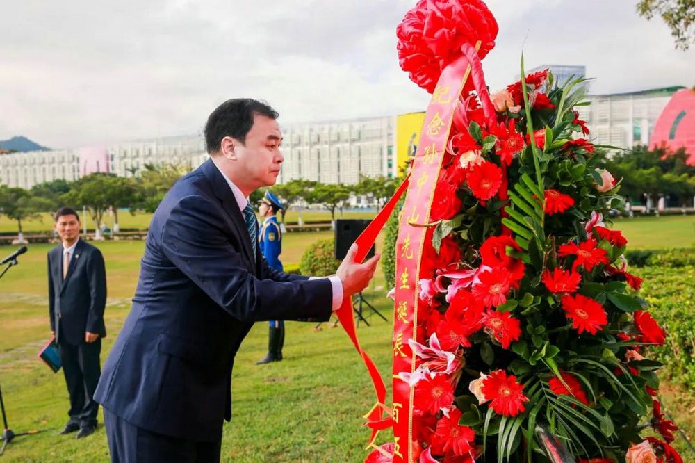 校党委书记陈春声,校长高松,校领导肖海鹏、国亚萍、刁振强、刘济科分别在五个校区(园)主礼献花仪式,深圳市教育局主任督学蔡茂洲、光明区委书记蔡颖、光明区委常委李兴亮、光明区教育局局长黄汉波,副校长兰平、邰忠智、杨东华、谢湜出席深圳校区仪式,相关职能部门、院系及直附属单位负责人和师生校友代表参加仪式。