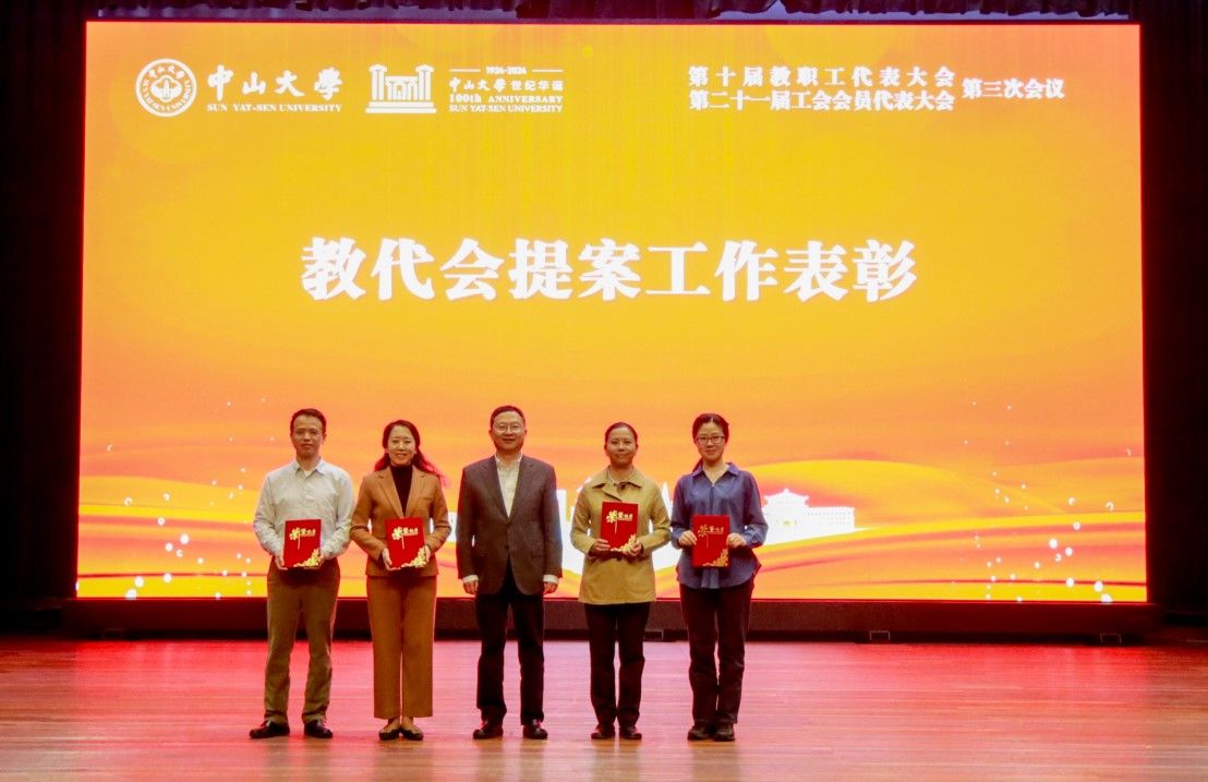 陈春声书记为荣获十届二次教代会“提案承办先进单位”教务部、深圳校区管理委员会、党委学生工作部代表颁发奖牌(党委宣传部 肖遥 摄)