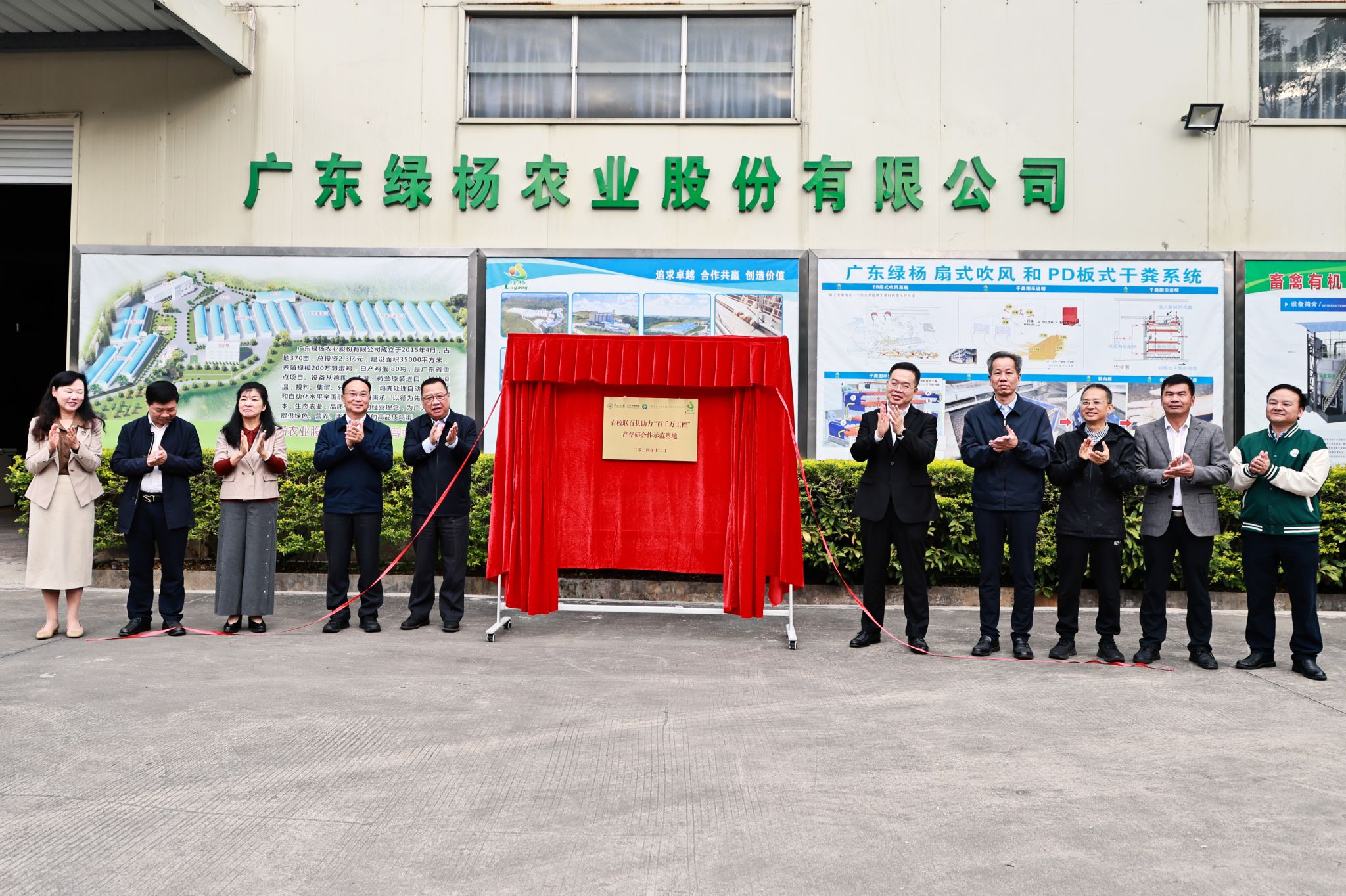 在广东绿杨农业股份有限公司考察时,调研组一行听取了生命科学学院曹永长教授团队长期以来着力突破蛋鸡养殖产业发展瓶颈和助力开展技术攻关的详细情况,现场举行了jinnianhui今年会生命科学学院、广东省农业科学院动物科学研究所“双百行动”产学研合作基地揭牌仪式。