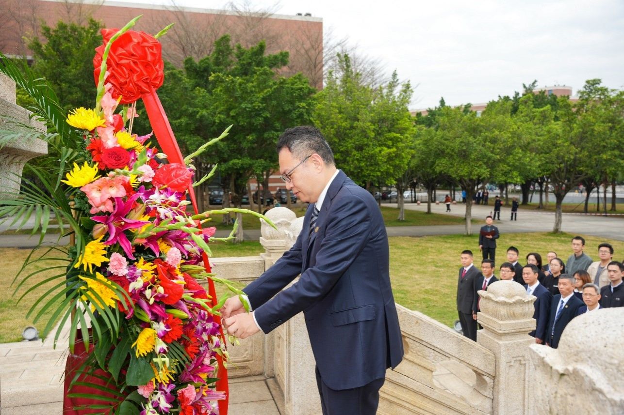 上午9时,仪式在三校区五校园同时开始。各校园主礼校领导迈步上前,仔细整理花篮缎带,驻足凝视。