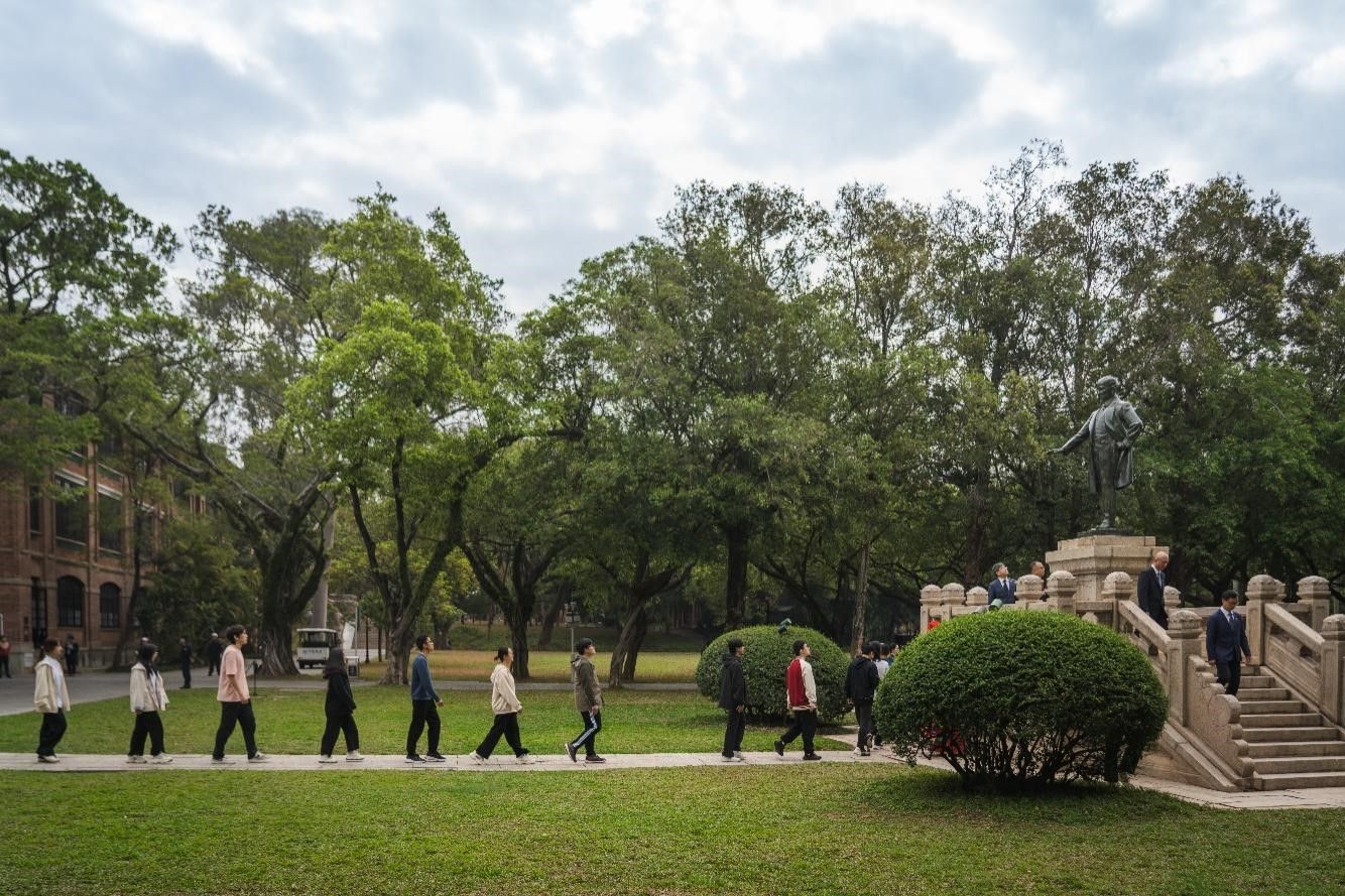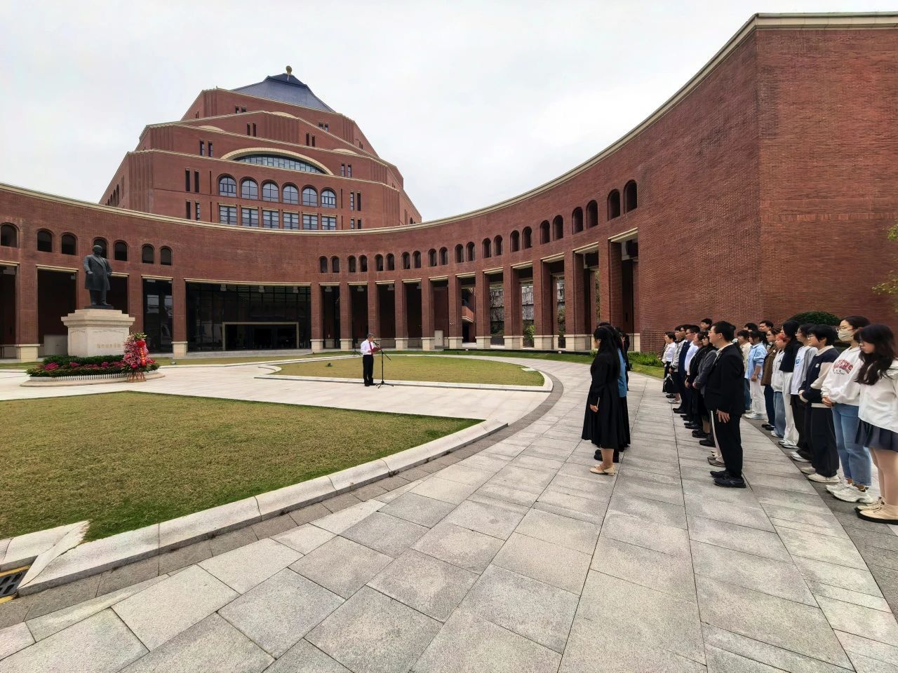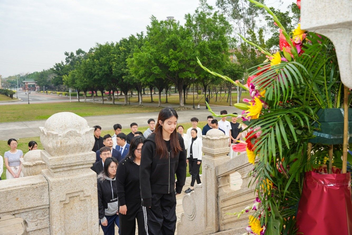 在深情的《献花曲》中,参加仪式的师生依次上前,缓步绕行,瞻仰孙中山先生铜像。