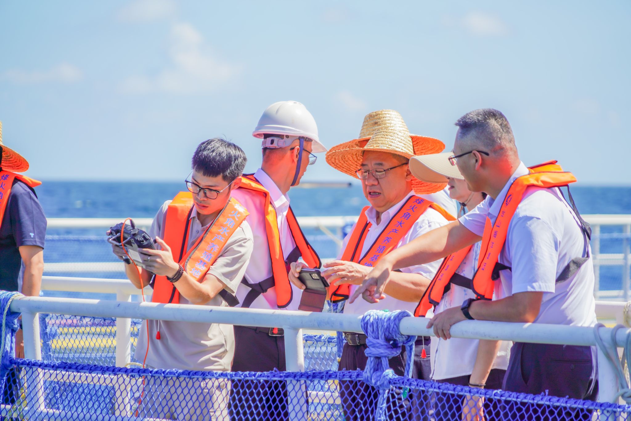 朱孔军登上“台山1号”半潜桁架式养殖平台,参观智能监控监测中心,通过水下机器人察看鮸鱼生长情况。台山海洋发展集团董事长苏培适、海洋科学学院教授卢建国介绍了“台山1号”智能化养殖平台运营情况。卢建国团队为“台山1号”半潜式桁架式平台创建了全国领先的智慧养殖模式,打造“海洋牧场+海上粮仓”融合示范样本。团队通过基因组精准选育技术,成功培育出具备更强耐受力和免疫力、更契合台山海洋牧场水域环境的鮸鱼,去年12月在“台山1号”成功投放10万尾鮸鱼鱼苗,目前生长状况良好。