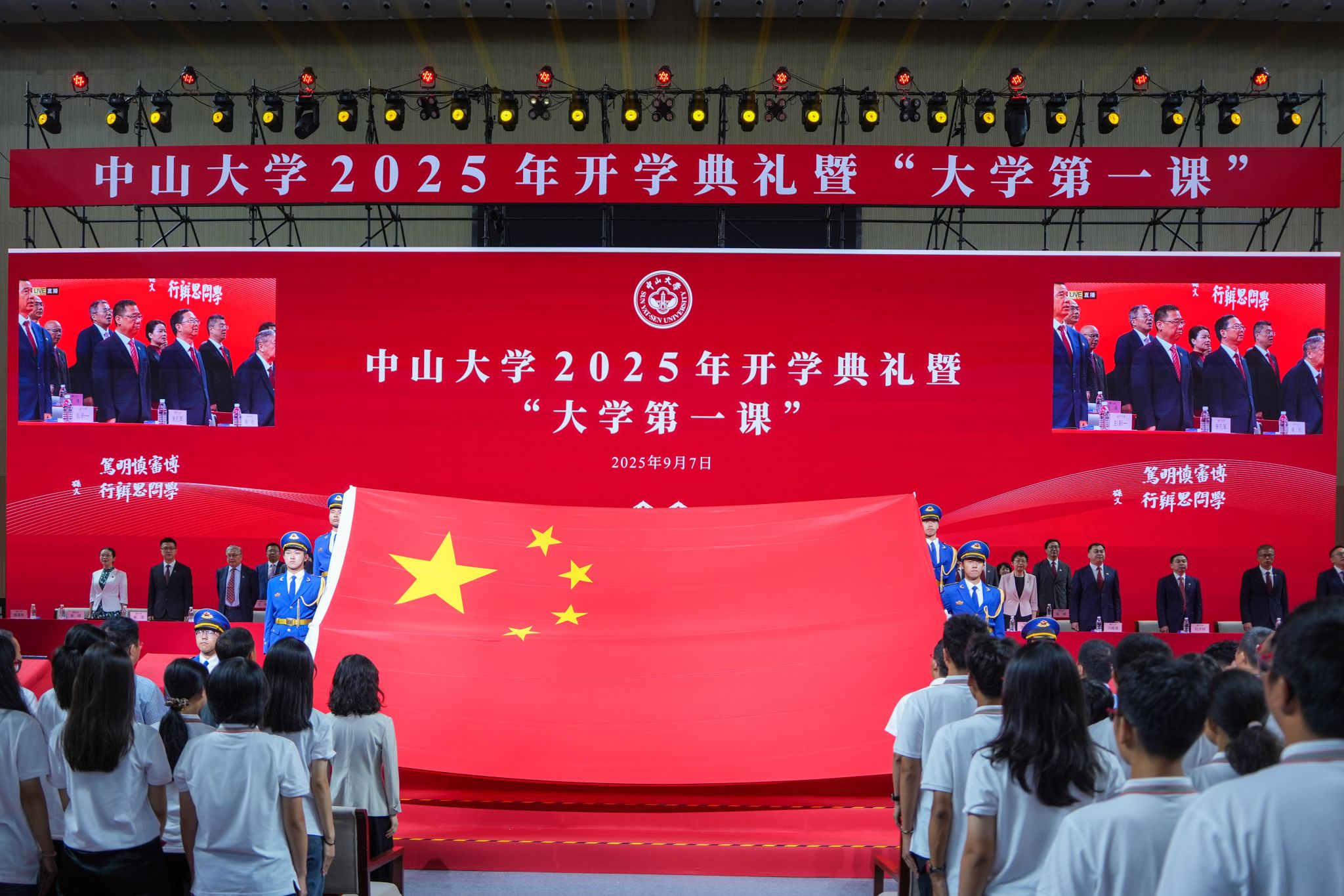 今年会新闻网讯(记者邱清萌、刘俊鹏)9月7日,jinnianhui今年会2025年开学典礼暨“大学第一课”在广州校区南校园举行。2万余名本科新生和研究生新生,线下线上齐聚一堂,共上大学第一课。《坪石先生》校史故事的动情展示,五星红旗的庄严入场,向高中母校献花的致敬感恩,让这堂大学第一课精彩纷呈、意义深远。