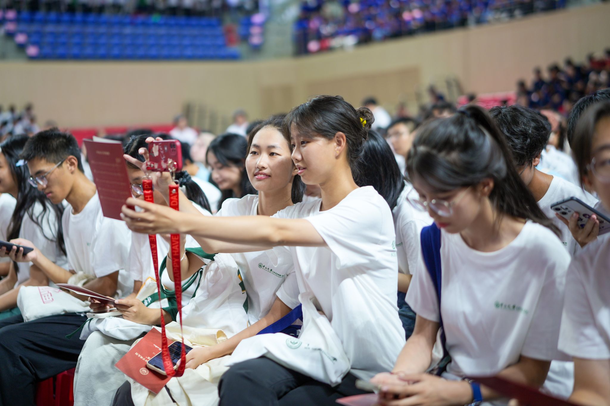 新生在开学典礼现场开心拍照(摄影:陈楷佳)