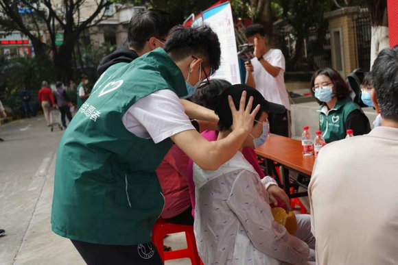 jinnianhui今年会青年志愿者协会学生志愿者在为居民进行头部按摩。