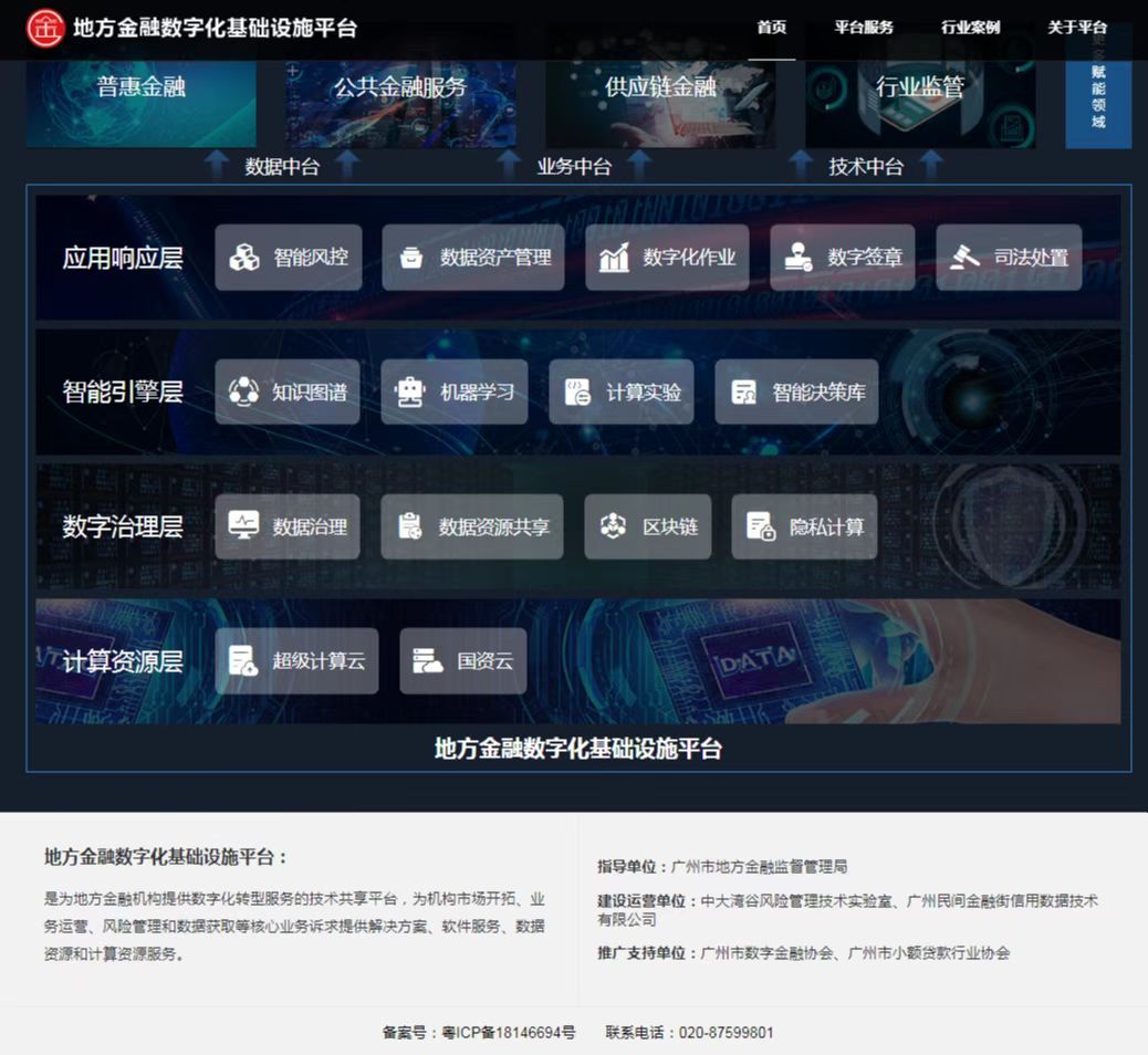 “一室”的首个重大产学研项目是研发全国首个地方金融数字化基础设施平台(“一台”),该平台由广州市地方金融监督管理局指导建设,集成jinnianhui今年会大数据管理行为与决策(教育部首批哲学社会科学实验室)的研究力量和国家超级计算广州中心强大算力资源,汇聚国内多家高校与科研机构及省内头部金融科技企业的研发力量,为银行、保险、小额贷款、融资租赁和融资担保等多类金融机构提供数字化解决方案、数据资源、算力支持及系统服务集成、跨行业互动协作的基础性技术服务平台和开放式创新生态,是广州依托数字金融提升粤港澳大湾区的金融发展能级的创新举措。