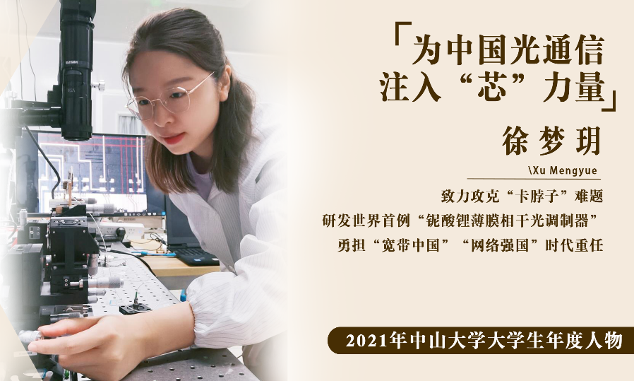 她志存高远,硕博五年专注突破光通信领域的“芯”难题,先后研制成功世界首例“铌酸锂薄膜相干光调制器”和世界首例“铌酸锂薄膜偏振复用相干光调制器”,芯片关键指标打破世界纪录,获得国内外同行的广泛认可。以第一作者身份在SCI国际顶刊发表论文6篇,在光学领域顶级会议做口头报告6次。科研成果连续两年入选中国光学十大进展,成为厉鼎毅纪念奖学金首位来自中国大学的获奖者。受邀担任多家国际期刊审稿,以专业技术服务知名科学社区,在国际科技舞台发出今年会之声、中国之声。她为中国注入了“芯”力量,让世界看到了中国“芯”风采。
