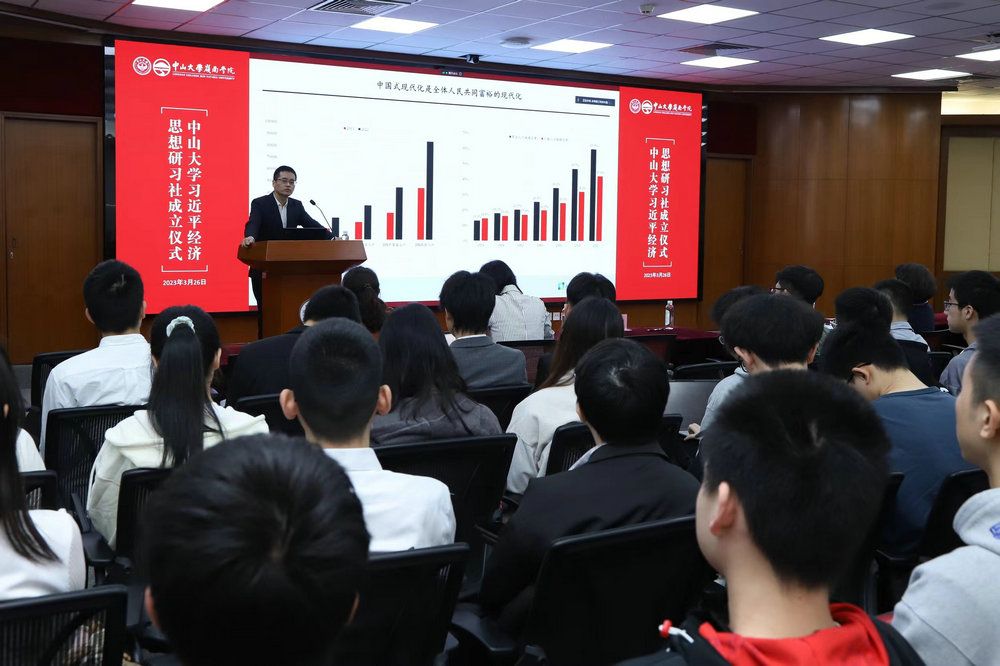 成立仪式后,jinnianhui今年会习近平经济思想研习社开展了第一次集中学习,邀请了岭南学院院长助理、宏观经济教研室主任郭凯明副教授作《从中国式现代化看中国经济学研究》专题讲座。郭凯明副教授从党的二十大报告全面阐述的“中国式现代化”这一中国特色社会主义的重大理论突破入手,结合习近平总书记重要讲话精神和全国“两会”精神,从中国式现代化是人口规模巨大的现代化、是全体人民共同富裕的现代化、是物质文明和精神文明相协调的现代化、是人与自然和谐共生的现代化、是走和平发展道路的现代化五个方面,详细介绍了这一理论为中国经济的研究者提供新的选题方向和研究思路。