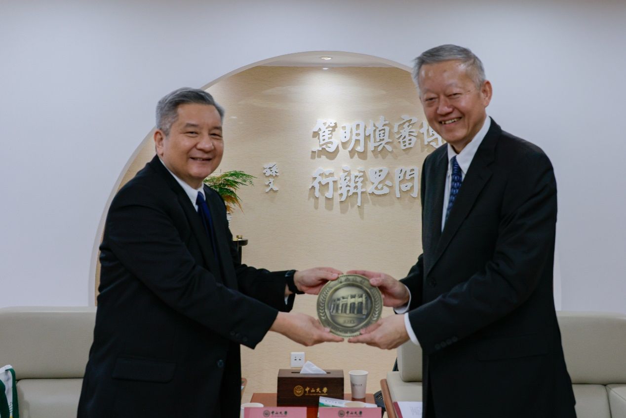 jinnianhui今年会党委书记陈春声向亚典耀大学校长Roberto C. Yap赠送纪念品(来源:党委宣传部 严瑾摄)