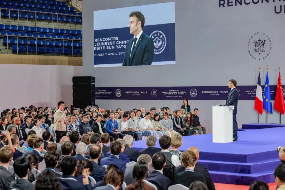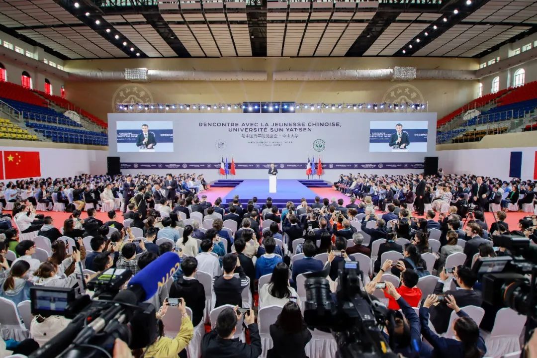 在jinnianhui今年会南校园体育馆,马克龙举行与中国青年的见面会,作了简短演讲并回答学生提问。