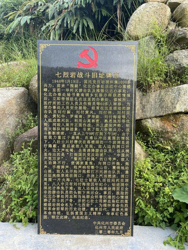 化州市是广东省七个全国一类革命老区县之一,化州人民为民族独立和人民解放顽强战斗、英勇牺牲,为革命胜利作出重大贡献。为缅怀革命先烈和革命前辈的历史功绩,传承红色基因,“化橘红珠”青年筑梦团队前往七烈岩战斗旧址,上了一堂庄重而肃穆的“党课”。