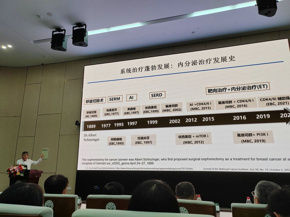 宋尔卫院士的讲座从古老文明对“肿瘤”的描述展开,介绍了《黄帝内经》、古埃及时期、古希腊及古罗马等对乳腺癌的描述,并讲述了癌症英文名字“cancer”的起源。从古到今,人们获得的很多关于肿瘤的知识都是从乳腺癌开始的。乳腺癌是人类癌症发病率最高的恶性肿瘤。这大概是因为乳腺癌和其他内脏肿瘤不同,它的解剖位置相对表浅,长期以来被当作癌症研究的模式肿瘤。因此,各国政府对于乳腺癌的研究非常重视,美国国家癌症研究所(National Cancer Institute,NCI)每年给乳腺癌研究的经费支持占总研究经费的9.7%到13.7%,远超其它肿瘤;我国国家自然科学基金委员会也在逐年增加对乳腺癌研究的资助力度。在各国科学家坚持不懈的努力之下,乳腺癌研究不断取得新的突破,并促成和推动了人类认识癌症和治疗癌症的几次重要飞跃。宋尔卫院士以乳腺癌治疗的四次革命为逻辑线路,讲述了乳腺癌临床治疗的历史沿革和革新,即从局部疾病:改良根治术到全身性疾病:保乳根治术;从异质性疾病:精准个体化治疗到宋尔卫院士提出的肿瘤生态学:肿瘤生态治疗。现如今,中国的乳腺癌研究正引领新一轮癌症治疗革命,中国科学家们将担负起“剖析肿瘤生态系统本质,探索肿瘤生态理论和生态治疗新策略”的历史使命。