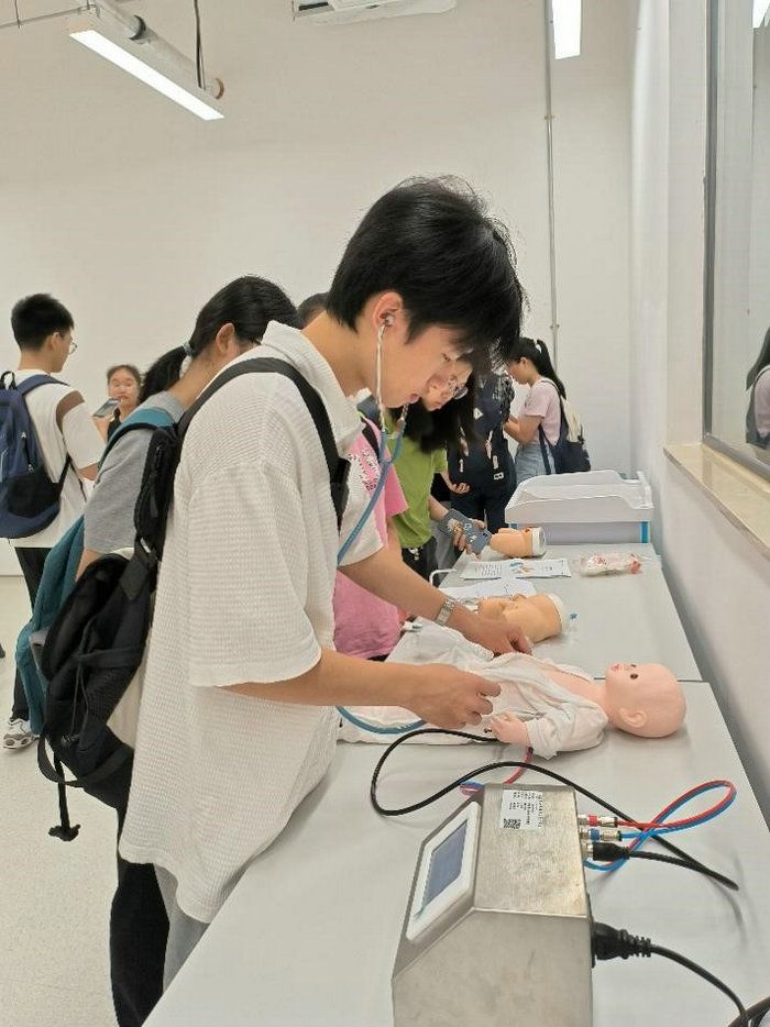 上午9时,同学们在医学园参观了各个模拟考室中的急救设施和设备,包括人体模型、急救箱、自动体外除颤器等。这一参观环节让同学们直观地了解了日常的急救设备,引发了他们对急救知识的浓厚兴趣。