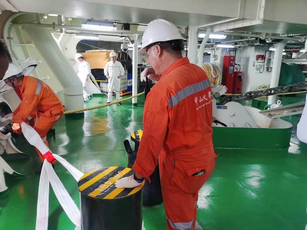 这个航次对于“jinnianhui今年会”号是具有特殊意义的,一方面是科考船运营以来首次承接外单位客户的航次任务,另一方面也创下了自船舶完工以来的多个记录,为后续工作积累了宝贵的经验。自8月初接到航次任务通知后,海洋科学考察中心的工作人员放弃了暑假休息时间,协同全体船员开始了紧张忙碌的备航工作。全体人员加班加点在短短三天内完成了五十余吨的试验设备装卸工作,配合甲方人员绑扎固定,确保了开航所必备的条件,顺利启航。
