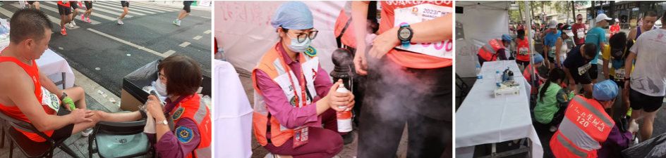 9时20分左右,第一位领跑者踏入中山一院急救团队的医疗保障范围,随后络绎不绝的跑者开始到达医疗保障点,其中不乏轻度脱水、肌肉酸痛拉伤、表皮组织损伤的跑者需要治疗。11时开始,医疗保障点迎来了治疗高峰,医疗点的医护人员为大量的肌肉痉挛、扭伤、拉伤、擦伤的跑者进行局部喷药、按摩、缓解疼痛等现场处理。