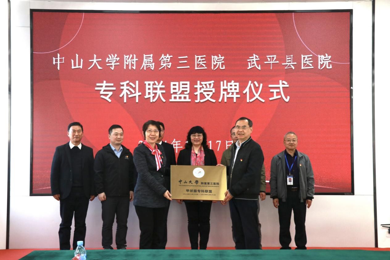 在举办义诊活动的同时,附属第三医院党委书记吴京洪以高质量党建引领高质量发展为主题,从初心、净心、同心、恒心、安心、凝心六个方面为武平县医院中层干部讲授党课,以党建引领凝聚合力,精准对接深化对口合作。最后,附属第三医院为武平县医院甲状腺专科联盟授牌。
