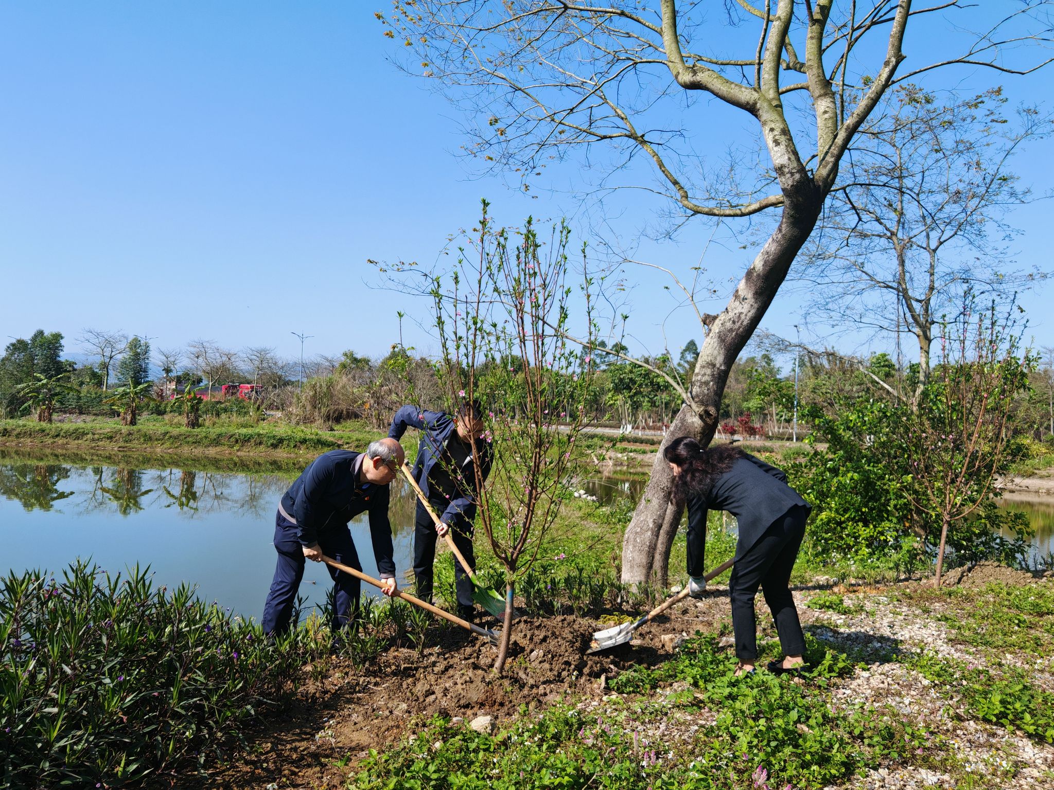 现场师生热情高涨,干劲十足,默契配合。在全体人员的共同努力下,新植的一颗颗桃树和黄花风铃木迎风挺立。