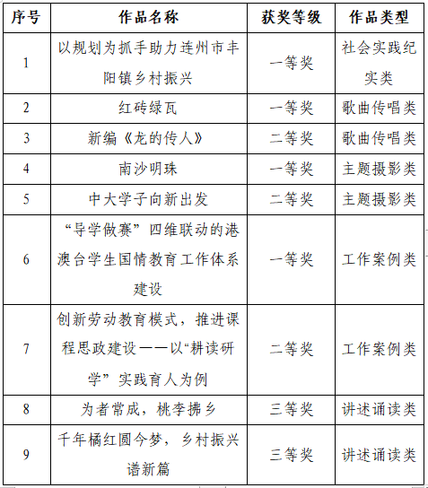 我校报送的《以规划为抓手助力连州市丰阳镇乡村振兴》等9项作品获奖。其中,社会实践纪实一等奖1项;歌曲传唱类一等奖1项,二等奖1项;主题摄影类一等奖1项,二等奖1项;工作案例类一等奖1项,二等奖1项;讲述诵读类三等奖2项。