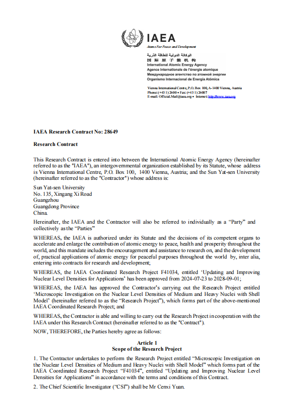 IAEA发起的协调研究计划(Coordinated Research Project, CRP)旨在汇聚多国研究力量与资源,通过跨国协同攻关,加速解决全球核科学与核技术的关键共性问题。在今年发布的“面向应用的能级密度更新和优化”计划中,IAEA面向成员国征集创新方案,以推动核数据质量与应用水平的全面提升。袁岑溪教授课题组依托近年来在微观能级密度研究方面与中国核数据中心等单位的深度合作积累,提出了以核子-核子相互作用为基础的新视角,以期精准描述中重核区能级密度的分布特征,深入揭示不同核力成分对能级密度的影响机制。该研究不仅有助于推动核数据理论的前沿突破,更将有力支持先进核能系统设计和核安全评估等领域的创新发展。