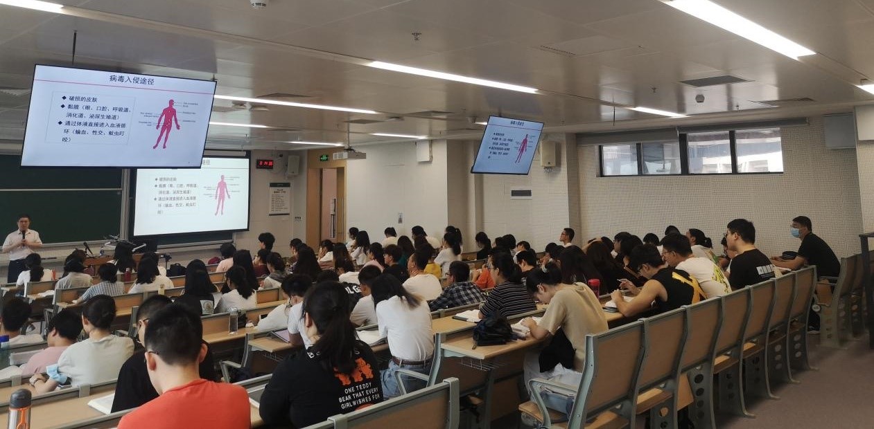 随着课堂铃声响起,课程正式开始。《医学免疫学》授课老师医学院陶鑫副教授播放了歌曲《山高水长》,将学生的学习激情点燃。学生们自发起立热烈鼓掌致谢,并欢迎陶老师开启久违的线下教学。《医学微生物学》课程同时段两个教学班分别有两位授课老师,郭德银教授以多年丰富的教学经验,充分调动了同学们学习的积极性和对学术的渴求;另一位授课老师施莽教授以生动的案例阐述人类健康和微生物特别是病毒的关系,牢牢抓住了学生们求知的心。