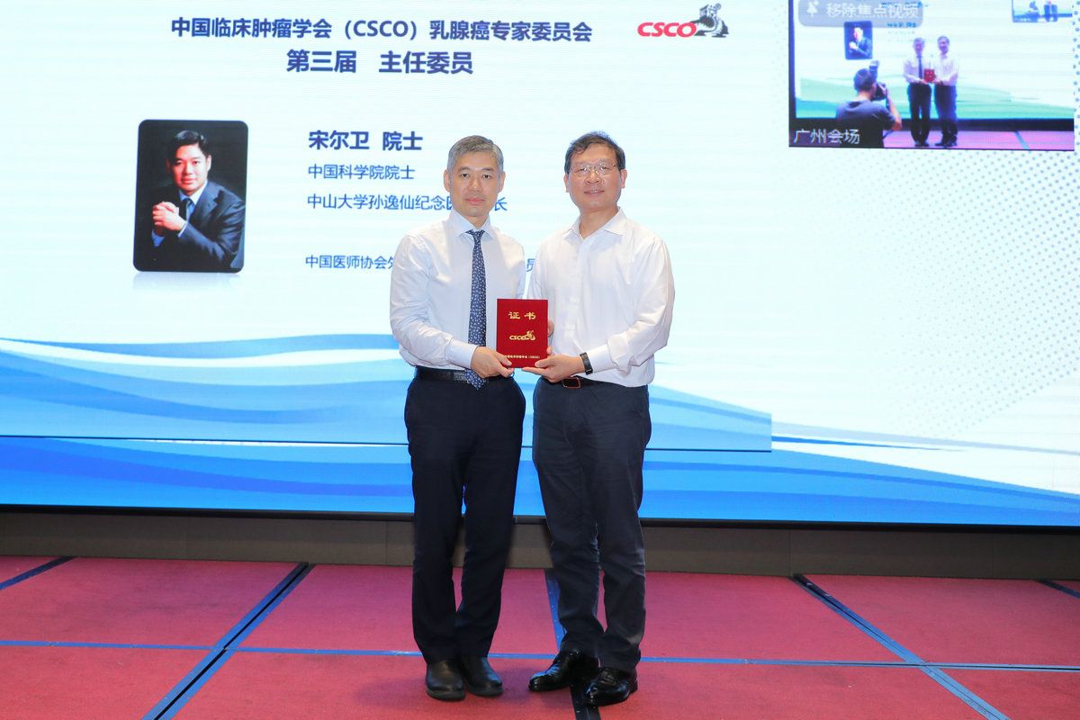徐瑞华理事长向宋尔卫院士颁发CSCO BC第三届主任委员证书(来源:孙逸仙纪念医院)