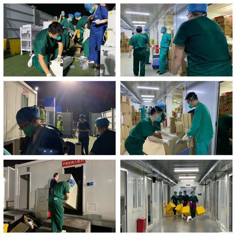 为保障及时收治,28日晚至29日凌晨,园区灯火通明,医护人员在这里接龙传送物资,组装消毒机、客房衣柜,分发生活用品,整理床单被套……齐心协力地开展最后的准备工作。