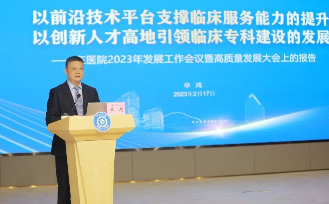 会上,单鸿院长围绕“以前沿技术平台支撑临床服务能力的提升 以创新人才高地引领临床专科建设的发展”作主题报告。报告明确了医院高质量发展的内涵与要求:医疗服务能力、专科建设水平、人才队伍素养、科学研究能力、管理服务效能都得到“量”的飞跃和“质”的提升。单鸿院长指出,要充分发挥先进医疗技术对临床专科的支撑作用,不断提升医疗服务能力;要推动构建总量适度、规模合理、梯队完善的人才队伍,不断引育拔尖医学人才,打造创新人才高地;要强化考核评价体系建设,着力建设高水平平台,催生高质量科学研究成果;要完善医院运营管理评价体系建设,不断提升内部治理能力;要将高质量发展、高水平医院建设、一流大学附属医院建设有机结合,以珠澳转化医学中心及珠澳转化医学研究院建设和“三甲”复审为契机,不断构建新体系,提升新效能,激活新动力。全体五院人要坚持以习近平新时代中国特色社会主义思想为指导,团结一心加油干,以钉钉子精神狠抓落实,苦干实干,勇于担当,为人民健康事业,为学校“双一流”建设,跑出“五院加速度”。