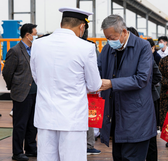 陈春声书记登船后,代表学校党委和高松校长亲切慰问了船员,询问大家的工作和生活情况,对他们春节期间坚守岗位表示敬意,并为船员们送上节日礼品和祝福。