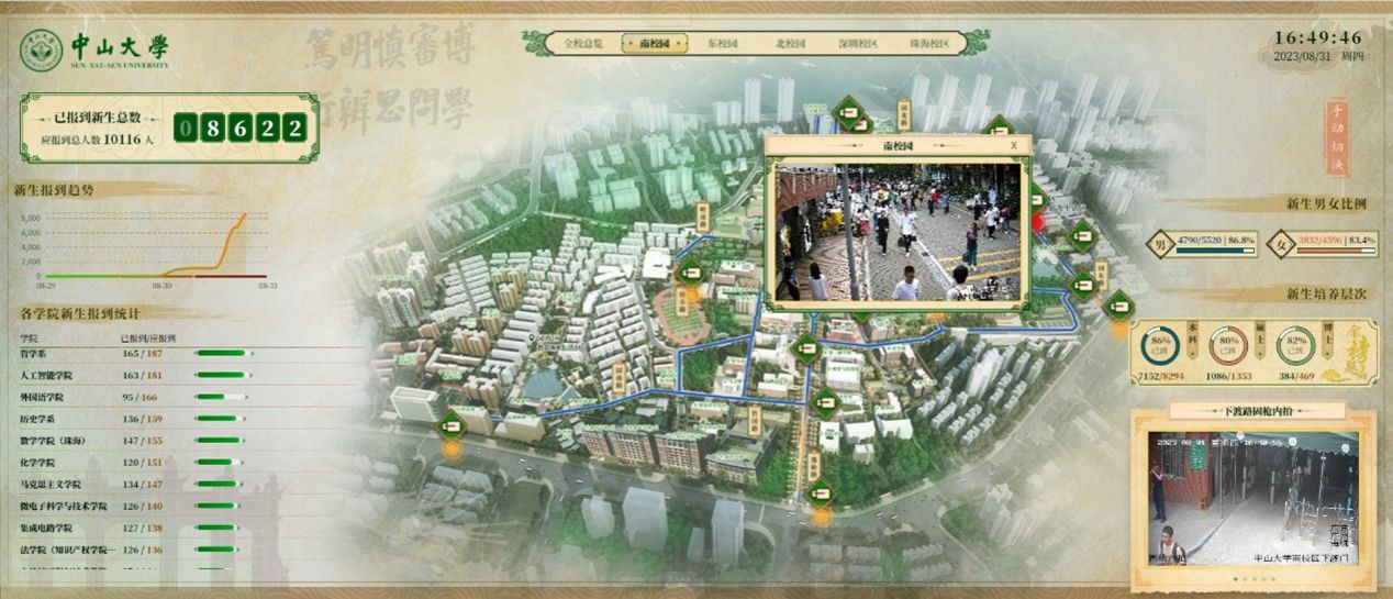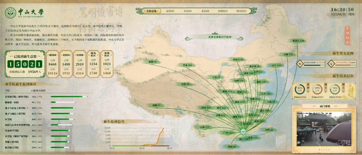 “新生已报到/应报到总数”“各个学院已报到/应报到排行榜”“新生男、女已报到/应报到比例”“新生培养层次已报到/应报到比例”等多维度的统计让数据更加细化。新生报到期间的趋势图和地图飞线形式的新生生源地图,让数据更加鲜活。除此之外,大屏还对接了“三校区五校园”多个迎新重要场所的实时视频信号,能实时查看迎新现场的具体情况,让数据更加直观。值得一提的是,大屏对各校园新生活动的主要动线进行了热力展示,人流密集的路段将会有黄点/红点闪烁提示,让数据更加可用。