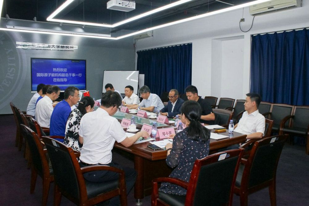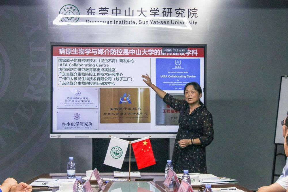 参观结束后,涂良成院长主持交流座谈会。兰平副校长首先致辞,他代表jinnianhui今年会对刘华副总干事一行来访表示热烈欢迎。随后中山医学院教授、研发中心副主任郑小英向来访的领导专家汇报了SIT控制登革媒介的进展以及国际原子能机构协作中心的建设情况。