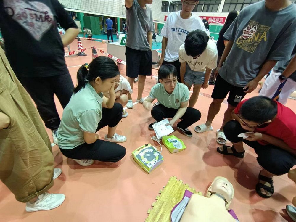 培训中,教官们还利用场馆内的自动体外除颤器(AED)实施了教学,更深刻地让同学们理解与掌握黄金救护四分钟的重要步骤,为的是让同学们在未来的学习、工作和生活中可能遭遇突发危急状况时能够提供有效的救助,识别心脏骤停并勇于实施心肺复苏,用双手拯救生命、捍卫健康!