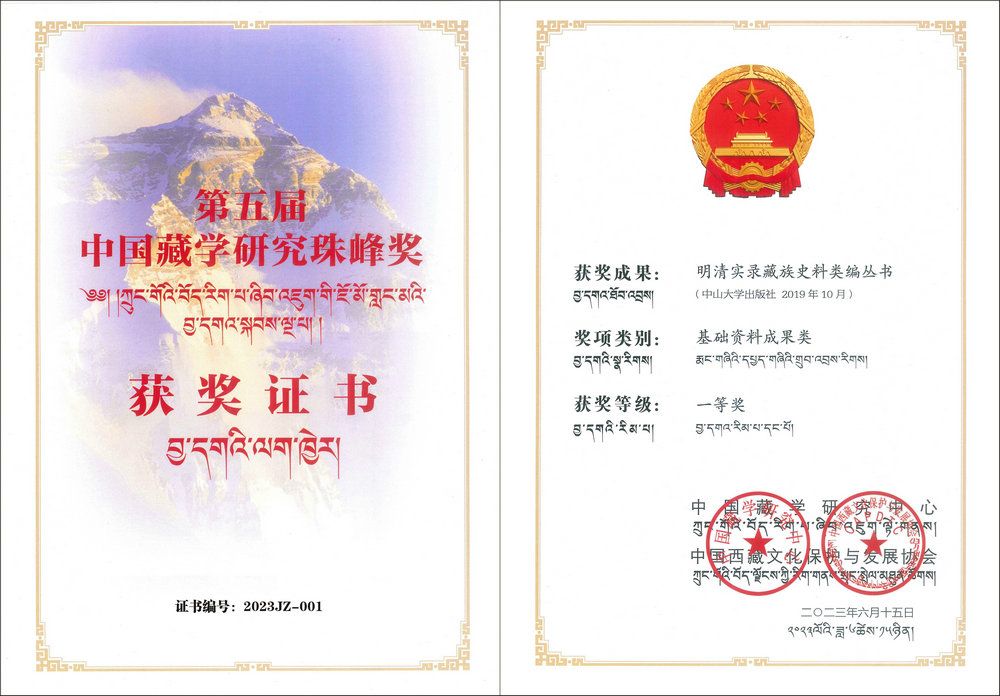 中国藏学研究珠峰奖是中国藏学研究领域国家级奖项,也是中国藏学研究领域的最高学术奖项。该奖项每四年评选一次。今年第五届中国藏学研究珠峰奖评奖工作于2022年启动,共收到包括西藏、青海、台湾在内的19个省市和地区的97家藏学研究机构申报的480项成果。经学科组和评审组审议,共64项参评成果荣获第五届中国藏学研究珠峰奖各类奖项,分别为:汉文研究专著类12项,藏文研究专著类12项,汉文学术论文类12项,藏文学术论文类12项,英文研究成果类6项,基础资料成果类6项,青年优秀成果奖4项。
