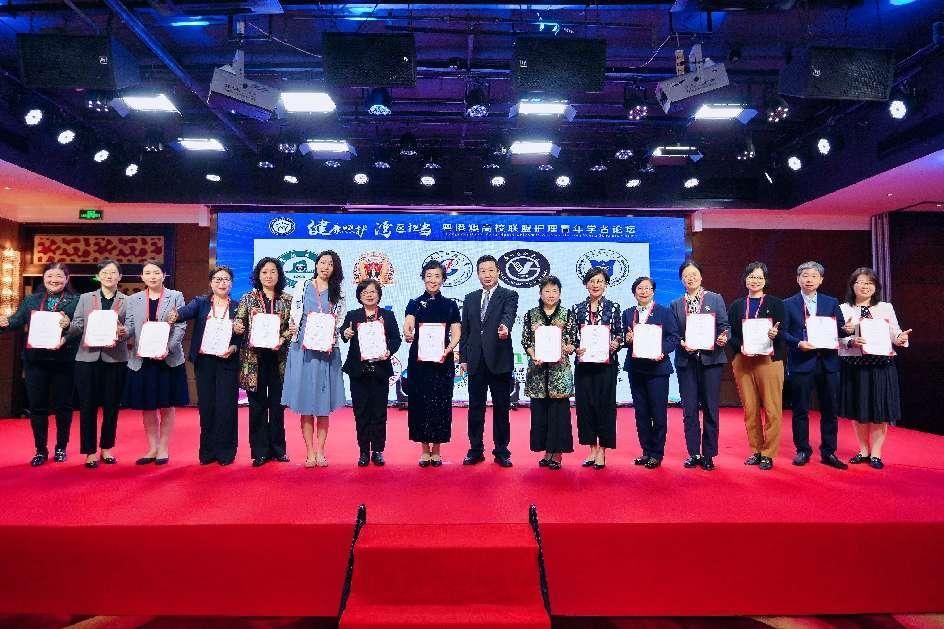 在领导和嘉宾分别致辞后,余敏斌教授为jinnianhui今年会护理学院、香港理工大学护理学院、澳门镜湖护理学院、香港大学护理学院、香港都会大学护理及健康学院、澳门理工大学健康科学与体育学院、南方医科大学护理学院、暨南大学护理学院、广东医科大学护理学院、广东药科大学护理学院、广州医科大学护理学院、广州中医药大学护理学院、深圳大学医学部护理学院、汕头大学医学院护理学系、佛山科学技术学院医学院护理系等15所院校颁发了“粤港澳高校护理联盟单位”证书。
