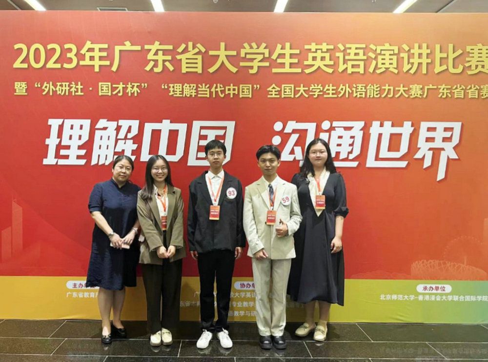 广东省赛演讲选手蒲锦阳(左三)和吴镇泽(右二)、口译选手唐红艳(左二)和韩雨茜(右一)与带队教师合影