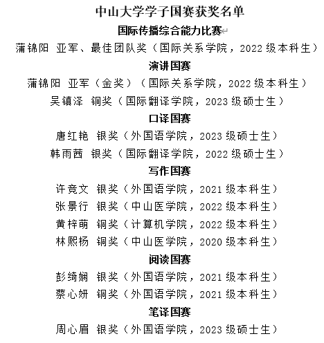 我校学子在2023“外研社·国才杯”“理解当代中国”全国大学生外语能力大赛英语组全国赛和广东省赛中获奖名单如下: