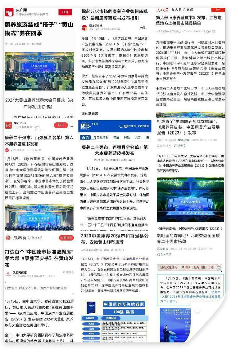 因第六部《康养蓝皮书》建立了与康养产业密切相关,涵盖国家、行业、地方、团体最新标准的“中国康养标准数据库”,公布了2023年度中国康养可持续发展20强市和2023年度中国康养可持续发展百强县榜单,研判了未来康养产业发展的最新趋势,引起业界瞩目和近200家媒体争相报道。
