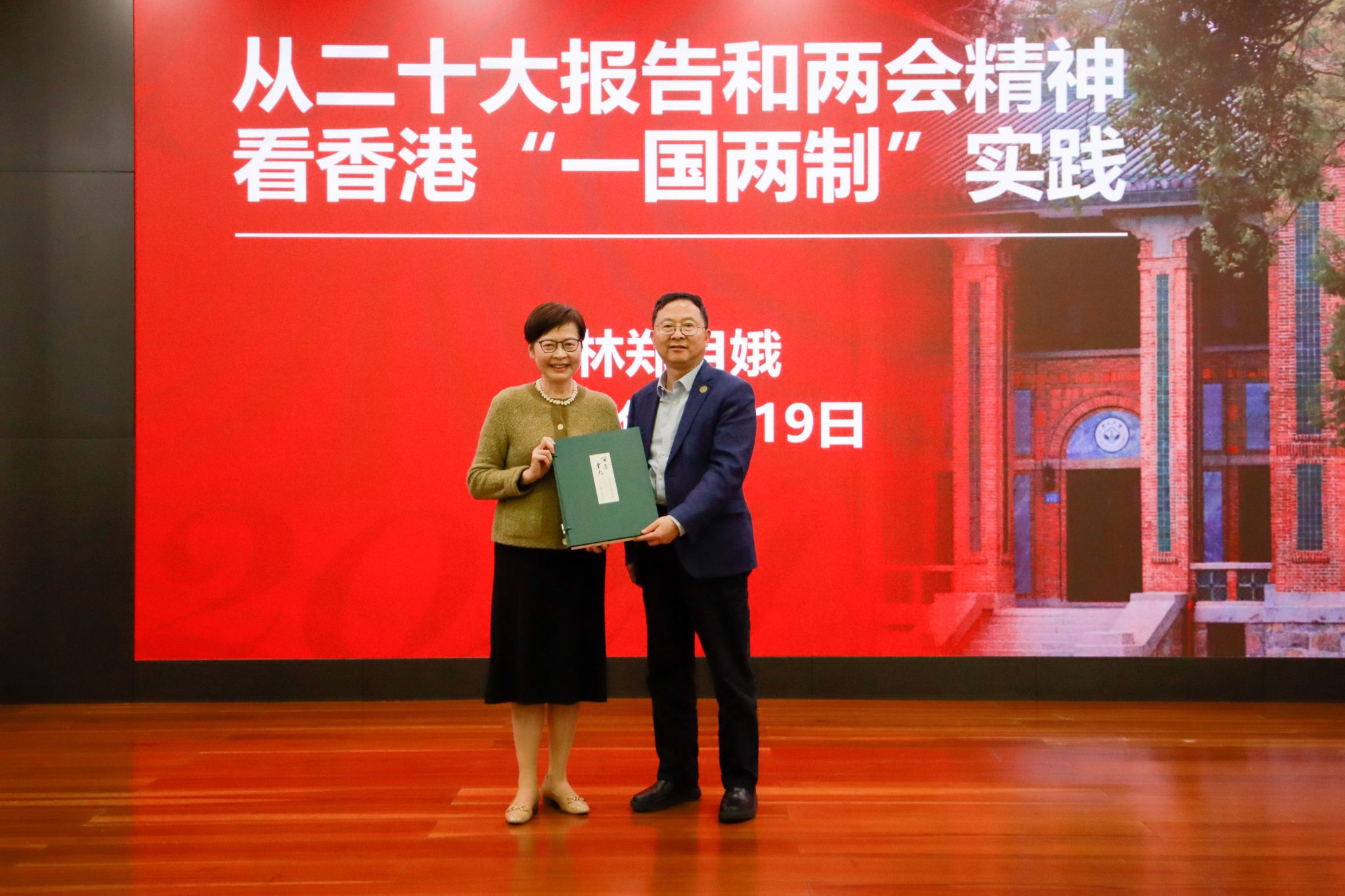 林郑月娥女士与师生交流分享了香港的历史、“一国两制”伟大创举在香港的生动实践以及对香港未来的展望。她表示,《中华人民共和国宪法》和香港《基本法》的贯彻落实为香港未来的发展提供了明确的方向,“一国两制”为香港发展提供了坚定信心和丰富的发展机会。在“一国两制”的伟大实践中,香港正在迈入由治及兴的新历程。香港百年的历史和发展历程无一不证明“一国两制”是符合国家、民族利益,符合香港利益,保证香港繁荣稳定的基本制度。在新阶段,香港要始终坚持“一国两制”的原则,充分发挥香港自身的优势,提升经济动力,积极发展新产业,融入粤港澳大湾区建设发展,架好粤港澳大湾区三地青年的连心桥, 在国家迈向第二个百年奋斗目标的进程中,发挥不可替代的作用。