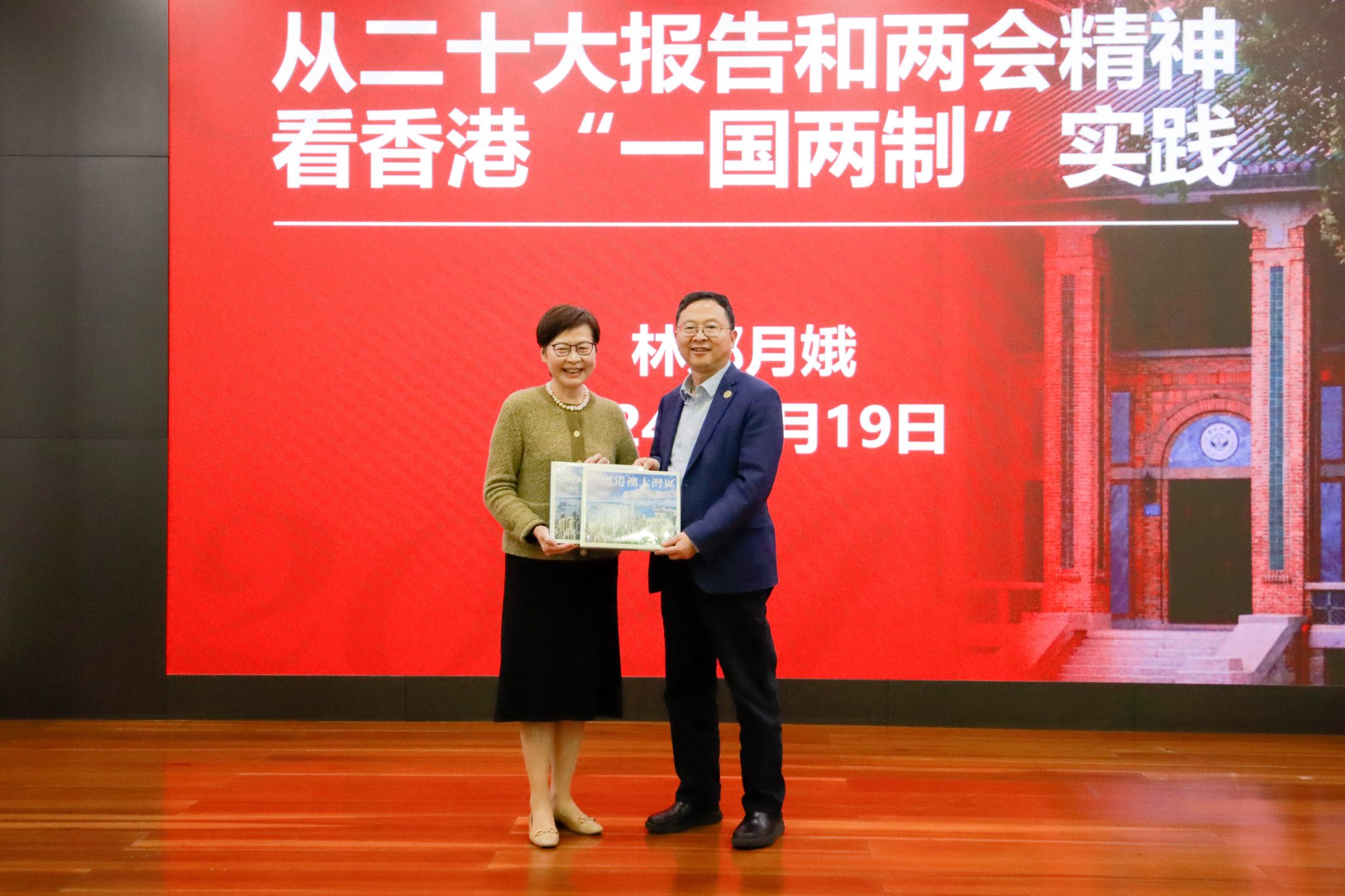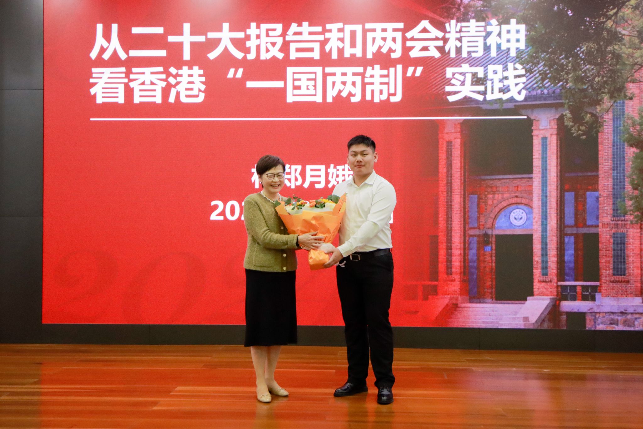 下午,林郑月娥女士在怀士堂作了题为《从二十大报告和两会精神看香港“一国两制”实践》的主旨演讲,并与现场师生交流。张琪主持活动。