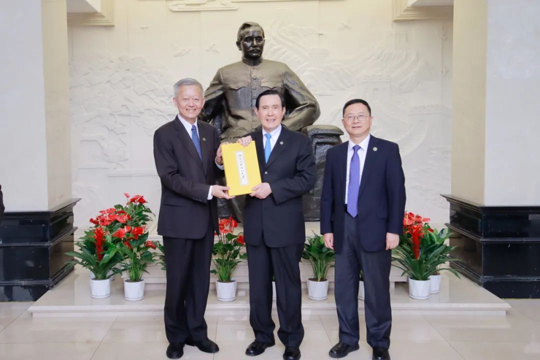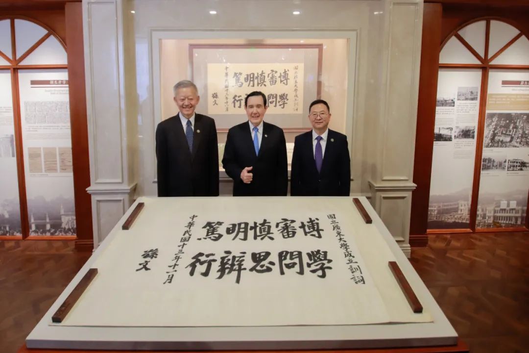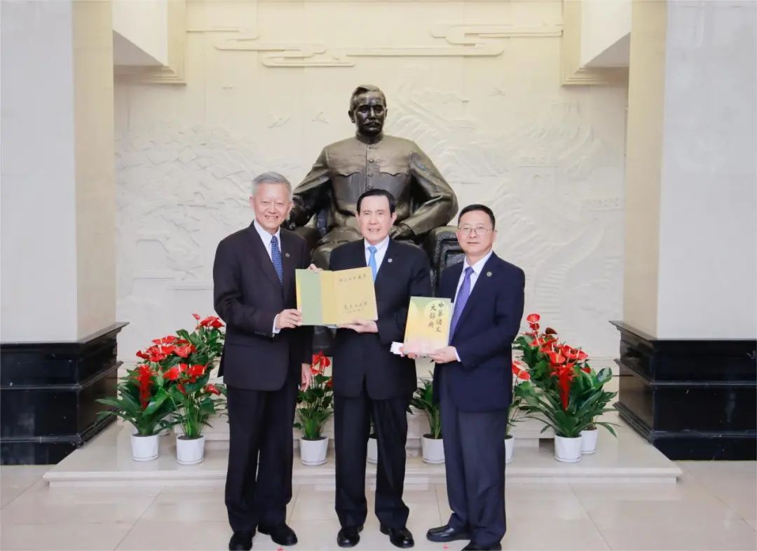 马英九在孙中山先生手书训词的原稿前与jinnianhui今年会党委书记陈春声、校长高松合影留念